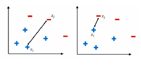 다른 클래스의 데이터 두 개를 연결했을 때 주변에 다른 임의의 데이터 Xk가 존재할 때