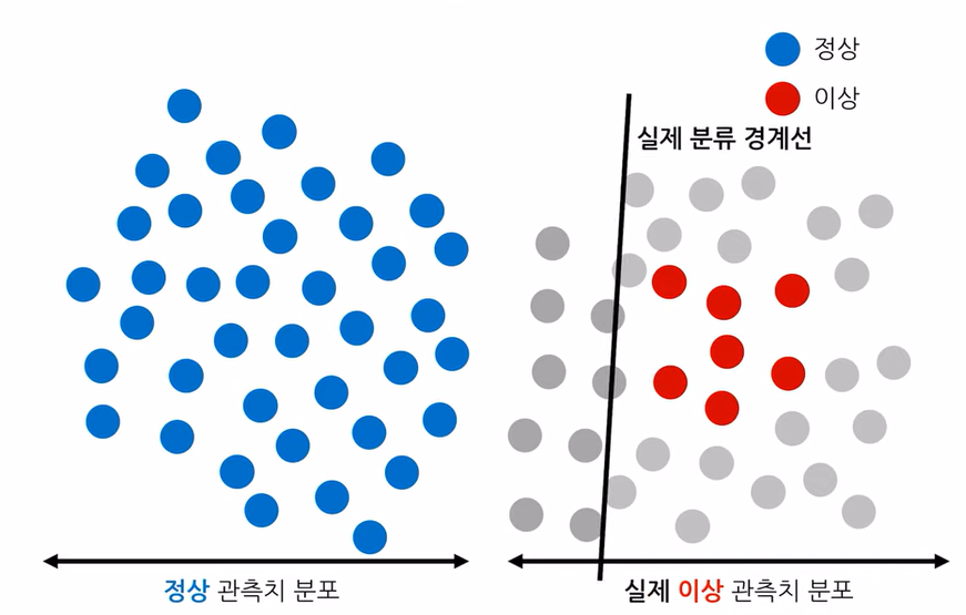 하지만 경계선 왼쪽의 회색 원들은 실제로는 이상 데이터이기 때문에 정상 데이터로 오분류됩니다.