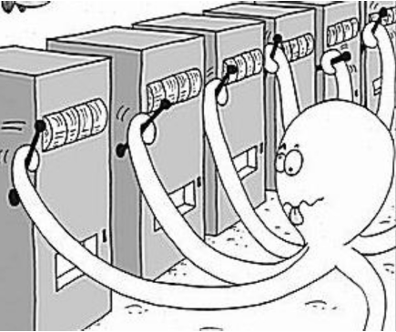 MAB는 강화학습으로 분류되지는 않지만 해당 원리를 활용한 알고리즘으로 위의 그림과 같이 각 슬롯머신에서 얻을 수 있는 Reward의 확률이 모두 다른 여러 개의 슬롯머신을 의미합니다.