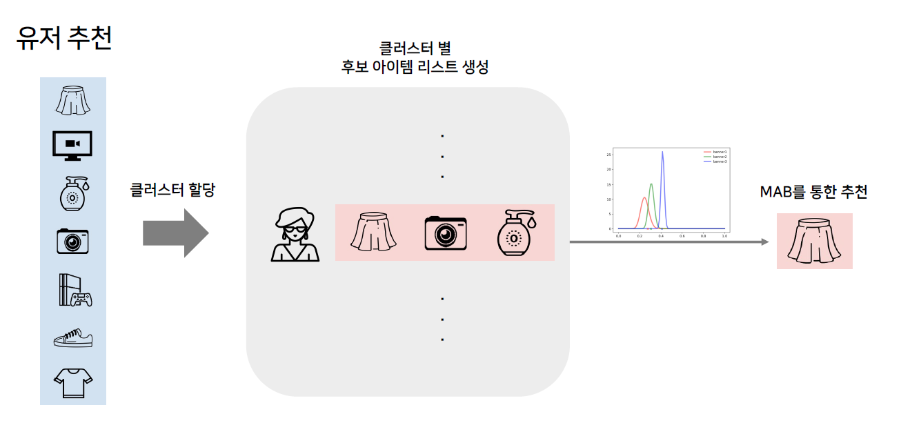 개인 유저에 대해 모든 아이템의 Bandit을 구하는 것은 불가능하기 때문에 클러스터링을 통해 비슷한 유저끼리 그룹핑한 뒤에 해당 그룹 내에서 Bandit을 구축합니다.