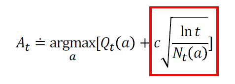 따라서, UCB는 현재 해당 action이 최적의 action일 수도 있는 불확실성을 고려해서 최적의 action을 선택하는 알고리즘입니다.