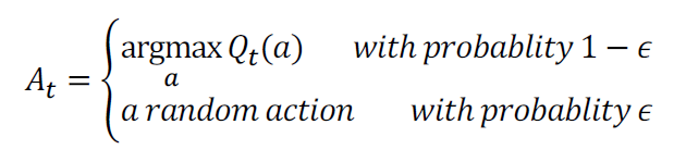greedy algorithm은 Reward가 가장 높은 arm을 선택하는 방식인데, 이 방식은 Exploration이 적어지게 되므로 일정한 확률로 Reward가 높은 arm이 아닌 랜덤으로 arm을 선택하는 방식입니다.